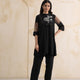 A timeless black coord set that blends modern elegance with subtle charm. The shirt features sheer organza sleeves and a applique work floral motif, adding depth and sophistication to the minimal silhouette. Paired with straight-fit trousers, this ensemble is perfect for evening gatherings, formal occasions, or chic festive celebrations.